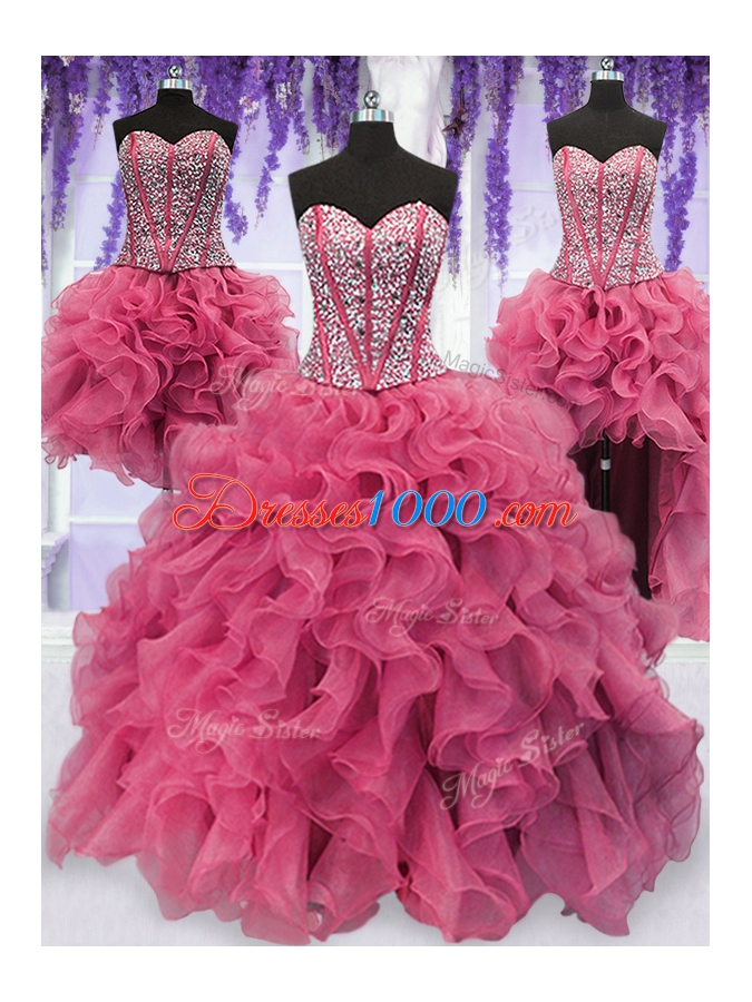 Four Piece Sequins Ruffled Floor Length Ball Gowns Sleeveless Pink Quinceanera Dress Lace Up
