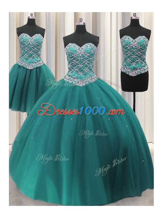 Traditional Three Piece Beading and Sequins Sweet 16 Quinceanera Dress Teal Lace Up Sleeveless Floor Length