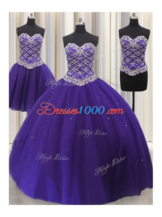 Trendy Three Piece Sweetheart Sleeveless Tulle 15 Quinceanera Dress Beading and Sequins Lace Up