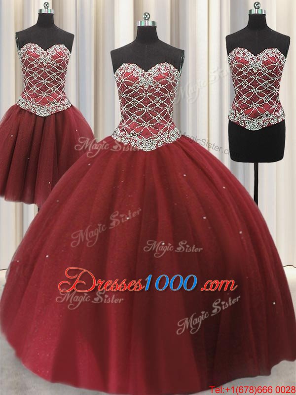 Popular Three Piece Tulle Sleeveless Floor Length Quinceanera Dress and Beading and Sequins