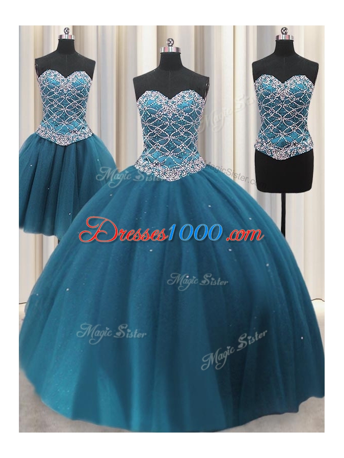 Three Piece Beading and Ruffles Quinceanera Dress Teal Lace Up Sleeveless Floor Length