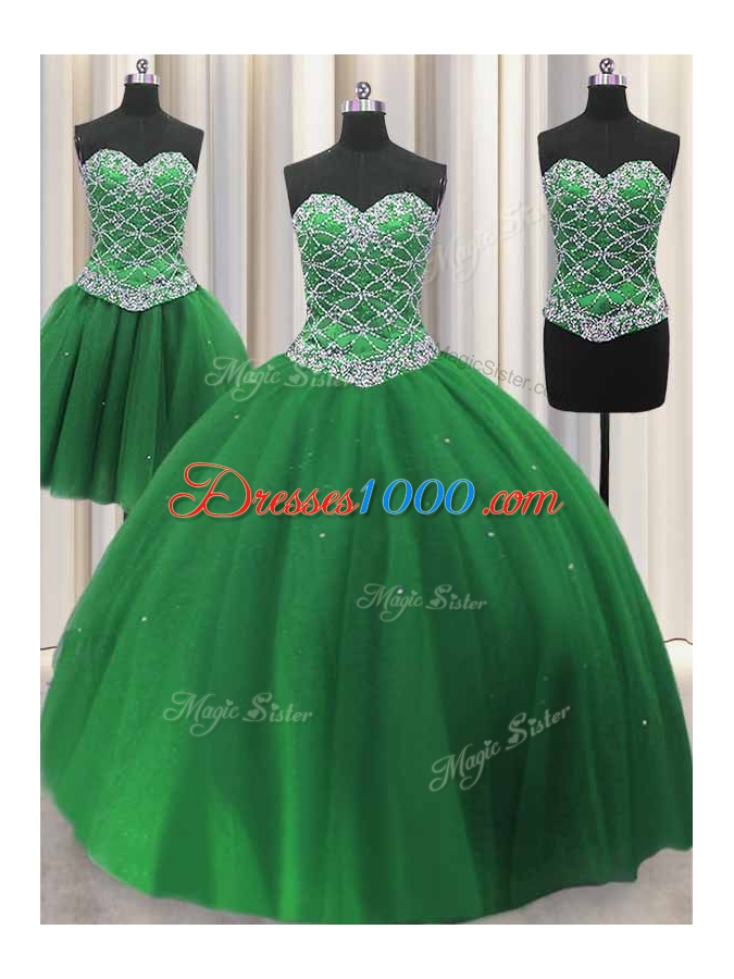 Flare Three Piece Green Tulle Lace Up Sweetheart Sleeveless Floor Length Sweet 16 Dresses Beading and Sequins