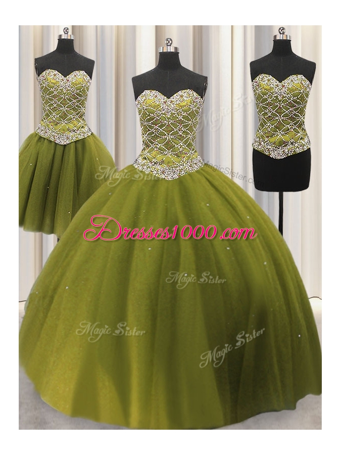 High Class Three Piece Tulle Sleeveless Floor Length Quinceanera Dress and Beading and Sequins