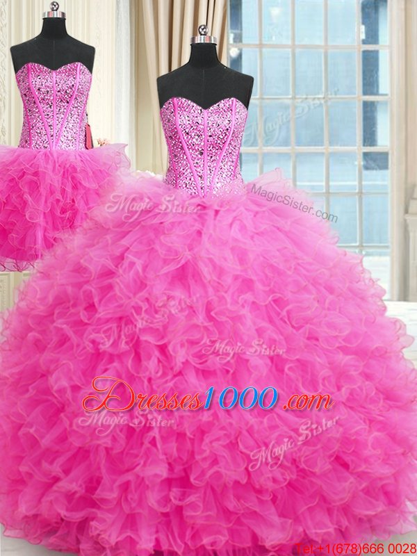 Fancy Three Piece Rose Pink Ball Gowns Beading and Ruffles 15th Birthday Dress Lace Up Tulle Sleeveless Floor Length