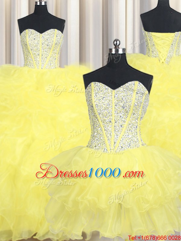 Three Piece Yellow Ball Gowns Organza Sweetheart Sleeveless Beading and Ruffles Floor Length Lace Up Quince Ball Gowns