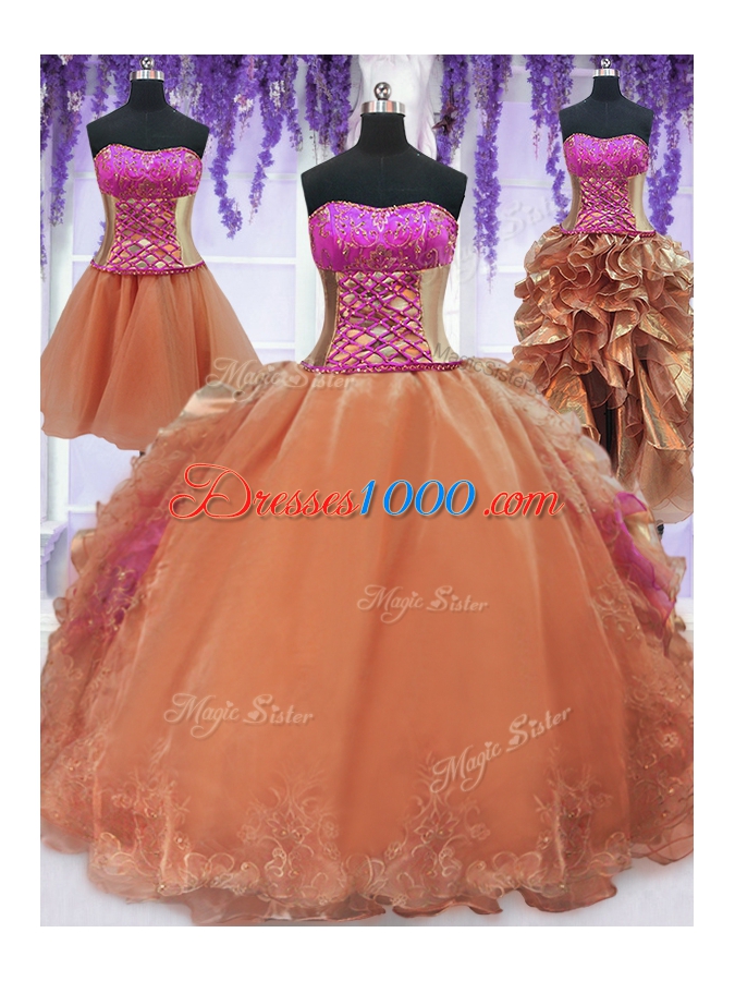 Shining Four Piece Orange Organza Lace Up Quinceanera Dresses Sleeveless Floor Length Embroidery and Ruffles