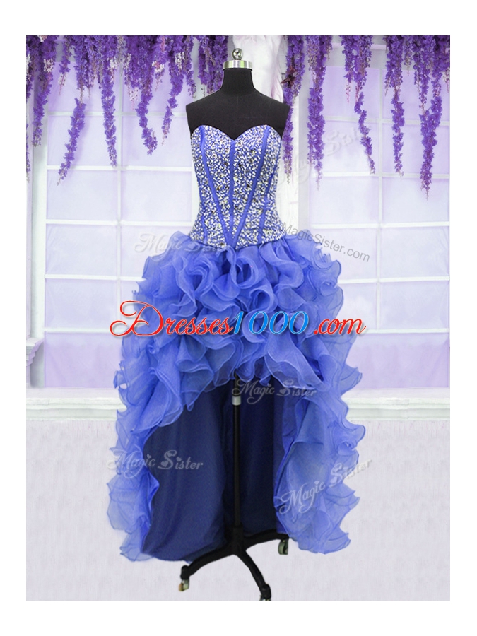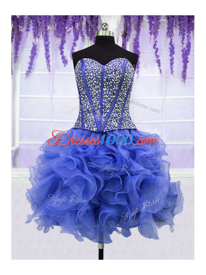 Four Piece Royal Blue Ball Gowns Ruffles and Sequins Quince Ball Gowns Lace Up Organza Sleeveless Floor Length