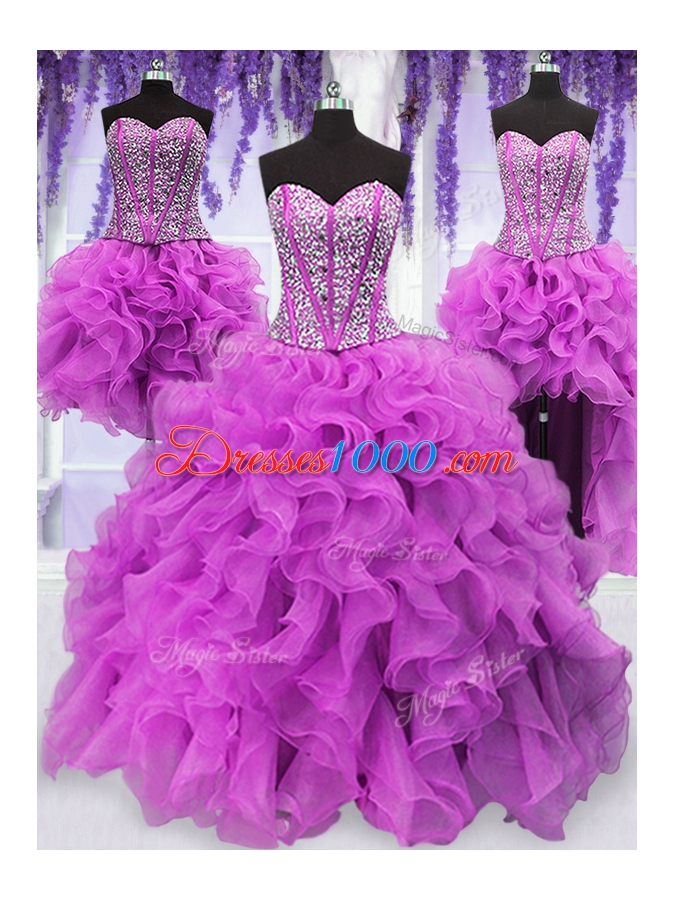 Fine Four Piece Sequins Floor Length Fuchsia Quinceanera Dress Sweetheart Sleeveless Lace Up