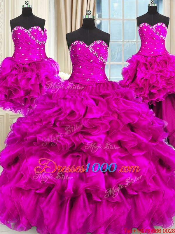 Four Piece Organza Sleeveless Floor Length Quinceanera Dresses and Beading and Ruffles and Ruching