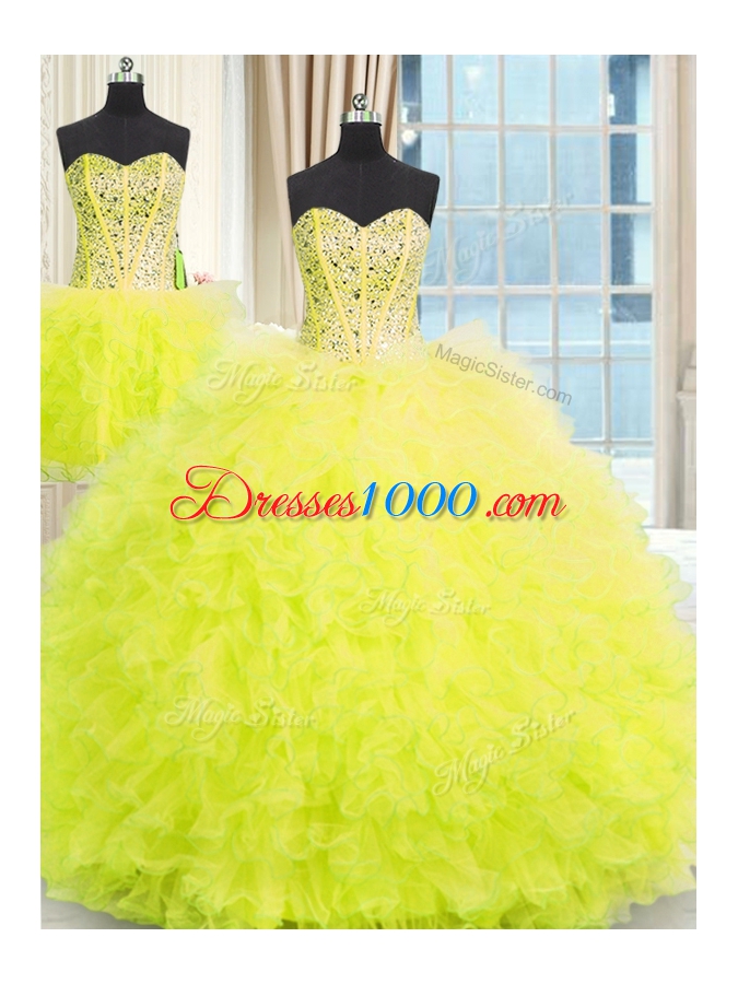 Sweet Three Piece Yellow Strapless Neckline Beading and Ruffles Quinceanera Gown Sleeveless Lace Up