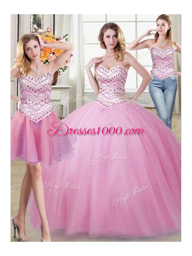 Fine Three Piece Tulle Sweetheart Sleeveless Lace Up Beading Sweet 16 Dress in Rose Pink