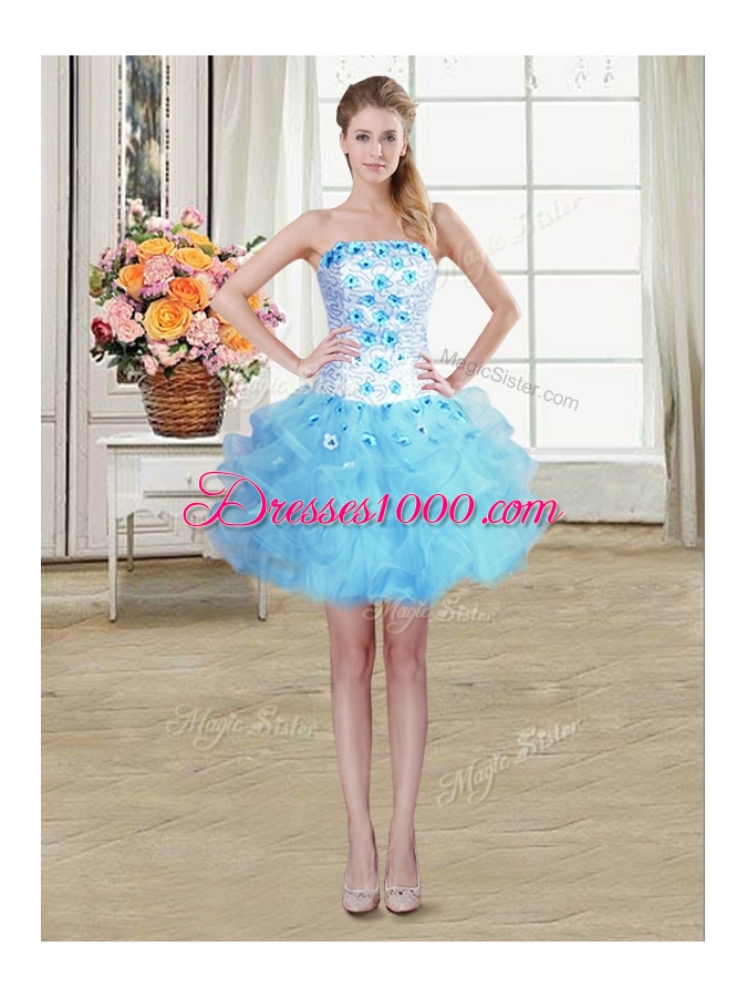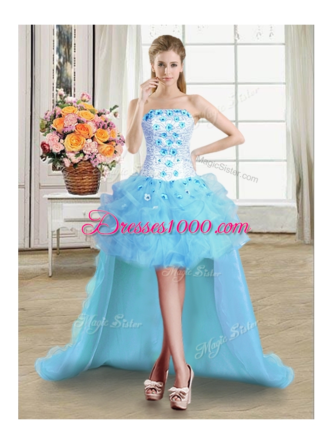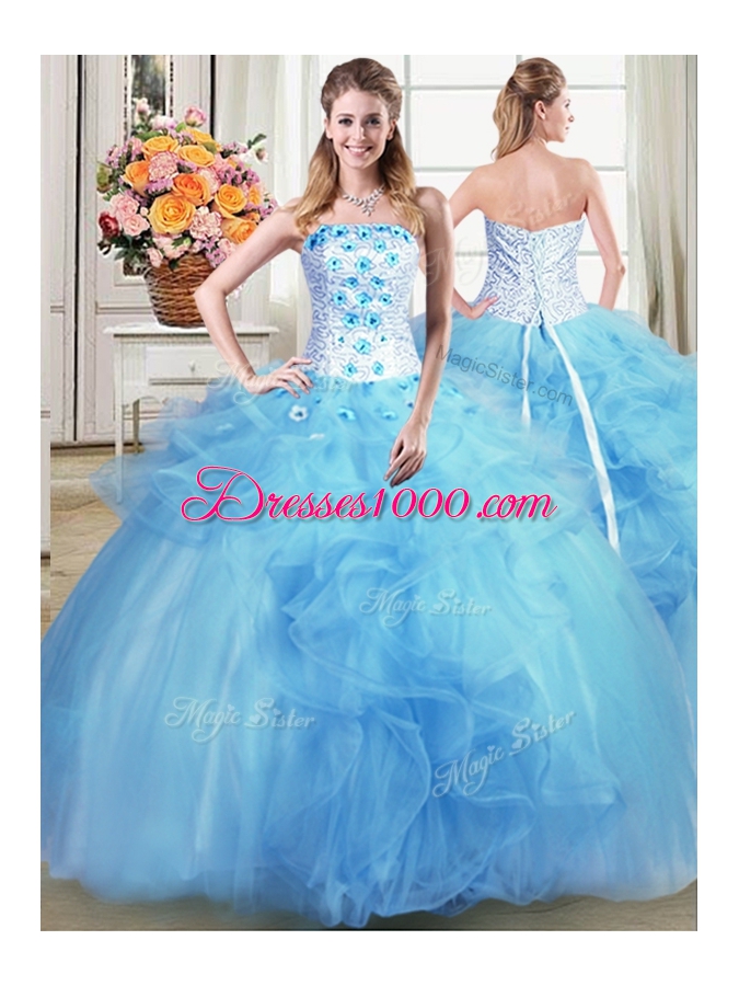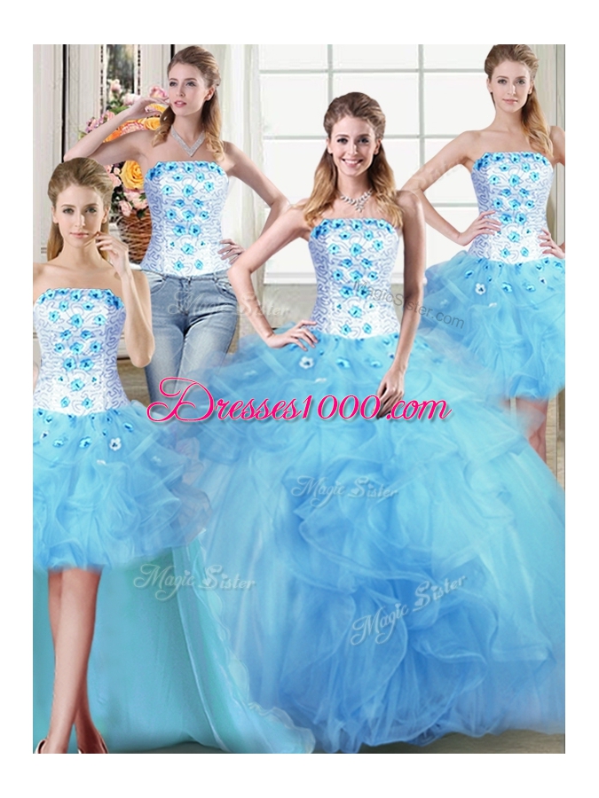 Wonderful Four Piece Light Blue Strapless Neckline Beading and Appliques and Ruffles Quince Ball Gowns Sleeveless Lace Up