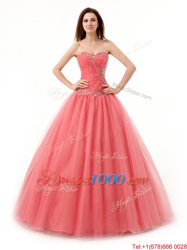 Trendy Watermelon Red Sleeveless Beading and Ruching Floor Length Quinceanera Gown