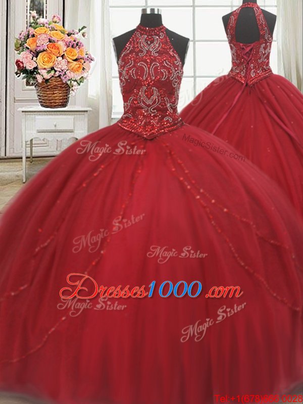 Halter Top Sleeveless Tulle Court Train Lace Up Ball Gown Prom Dress in Red for with Beading and Appliques