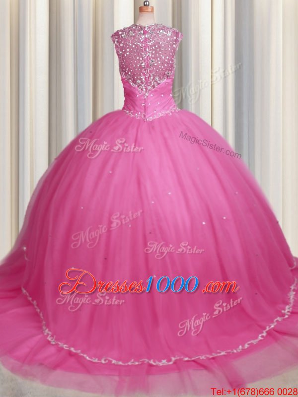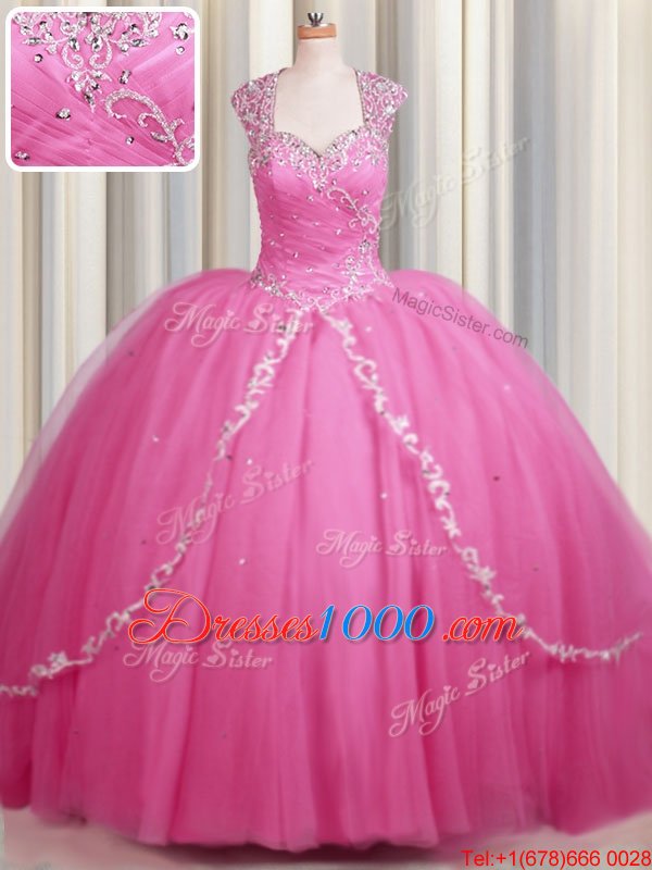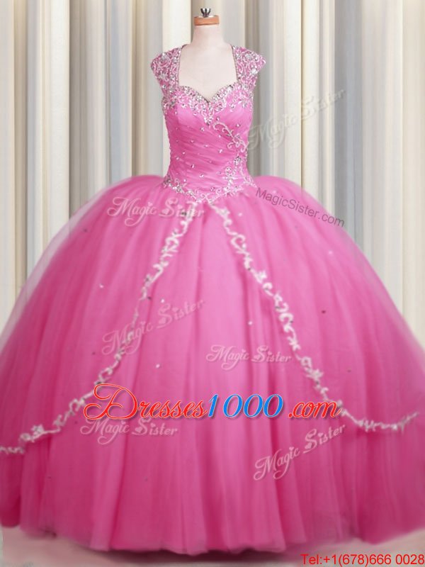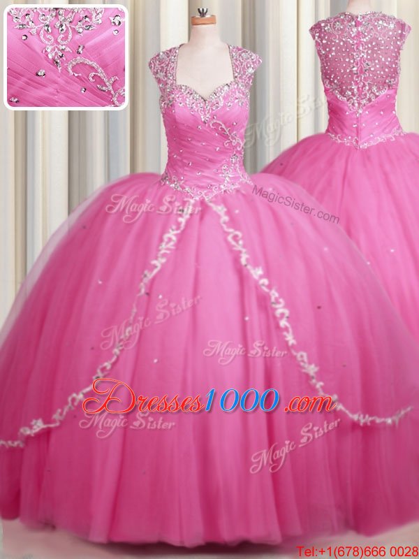 Zipper Up Brush Train Rose Pink Sweetheart Neckline Beading and Appliques Sweet 16 Dress Cap Sleeves Zipper