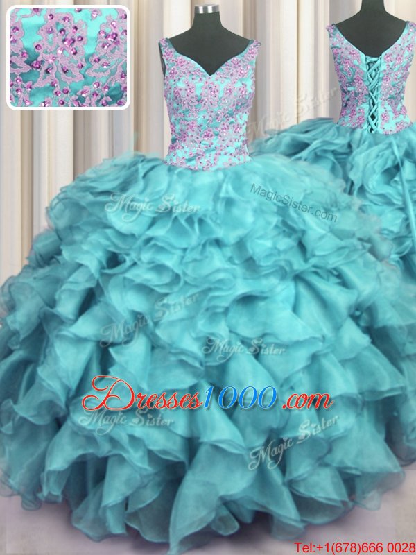 Ruffled V Neck Sleeveless Floor Length Appliques and Ruffles Lace Up Vestidos de Quinceanera with Aqua Blue