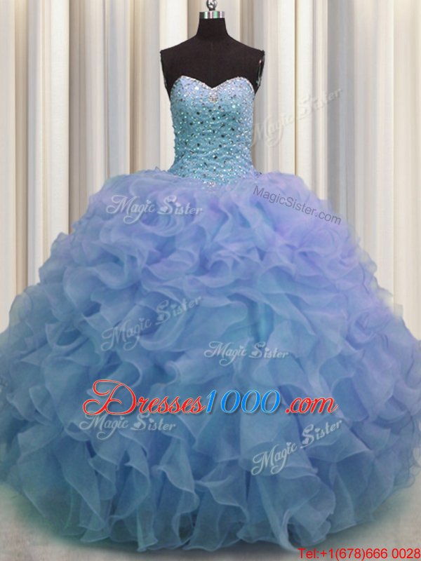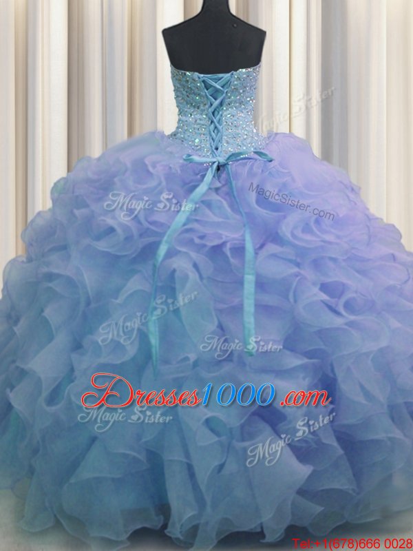 Free and Easy Bling-bling Beading and Ruffles Quince Ball Gowns Purple Lace Up Sleeveless With Brush Train