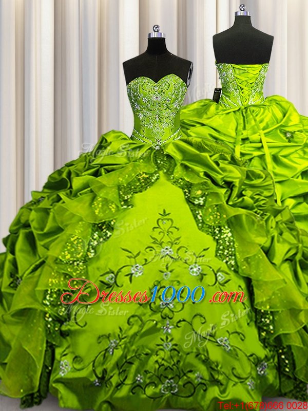 Floor Length Lace Up Quinceanera Gown Olive Green and In for Military Ball and Sweet 16 and Quinceanera with Beading and Embroidery and Ruffles and Sequins and Pick Ups