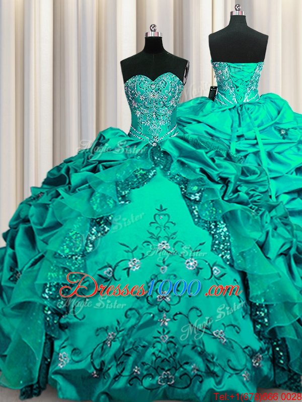 Traditional Sequins Sleeveless Floor Length Beading and Embroidery and Ruffles and Pick Ups Lace Up Sweet 16 Dress with Dark Green