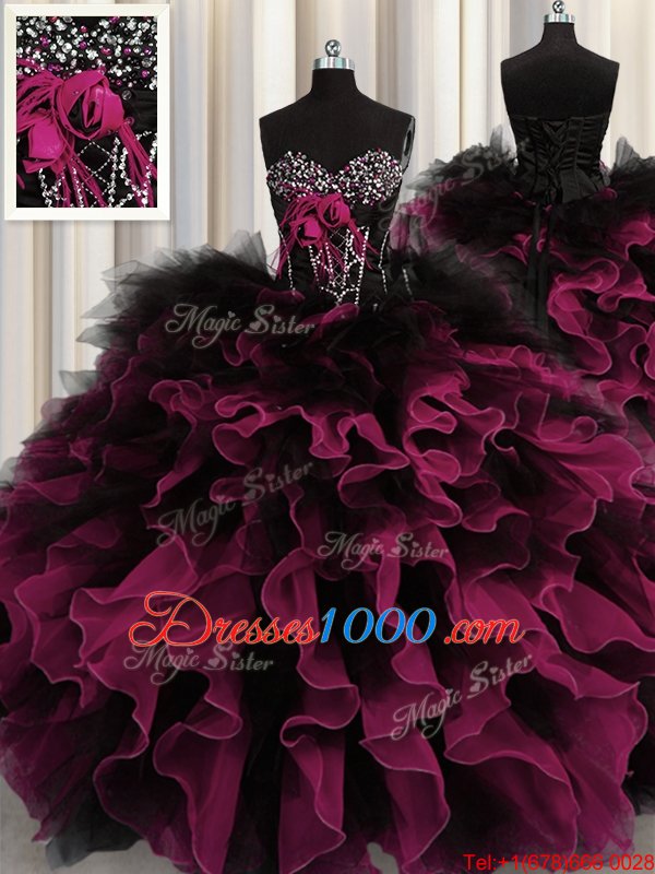 Beading and Ruffles Quince Ball Gowns Red And Black Lace Up Sleeveless Floor Length