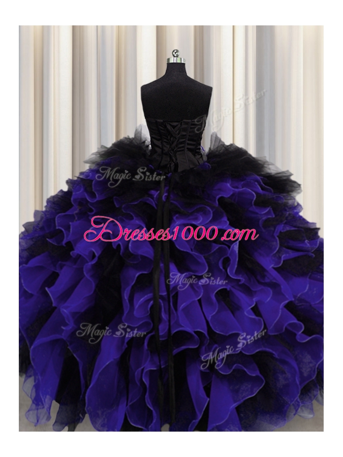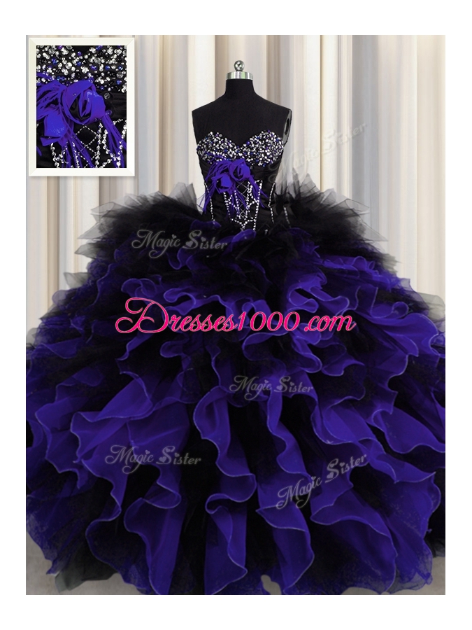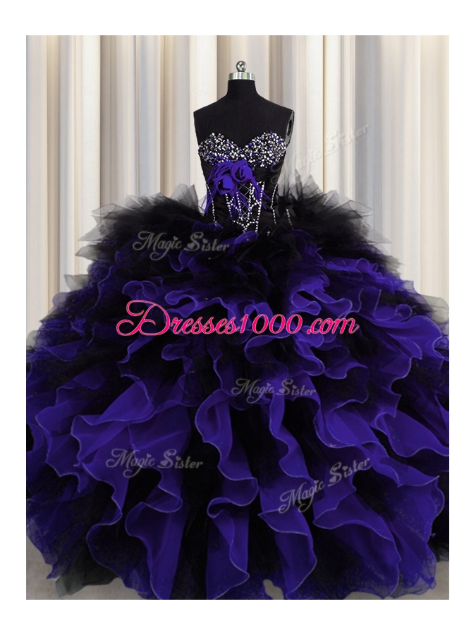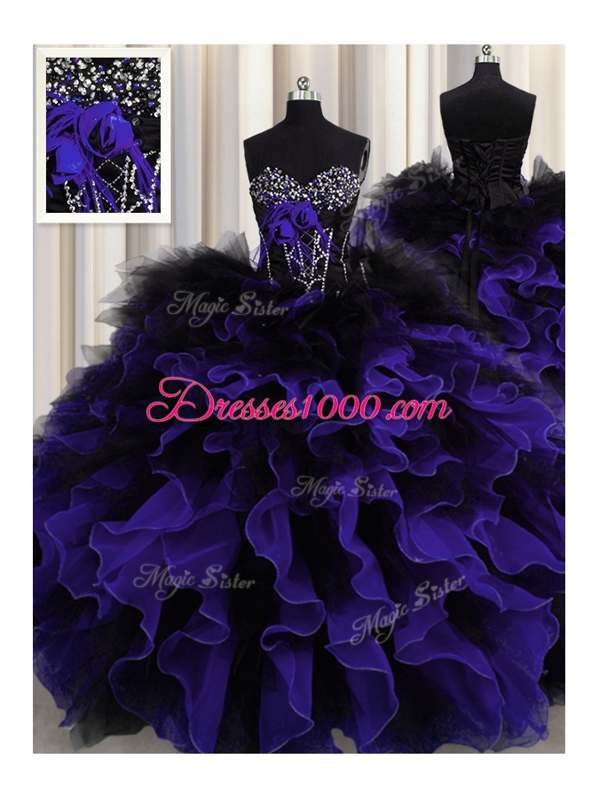 Great Black And Purple Organza and Tulle Lace Up Sweetheart Sleeveless Floor Length Sweet 16 Dress Beading and Ruffles