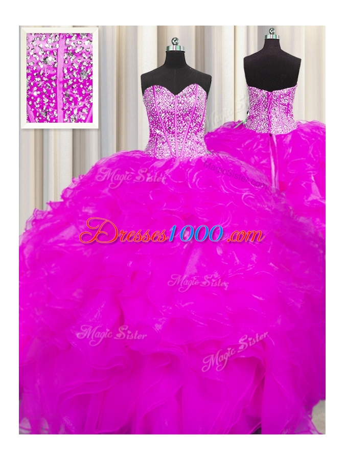 Visible Boning Beaded Bodice Fuchsia Lace Up Sweetheart Beading and Ruffles Quinceanera Dresses Organza Sleeveless