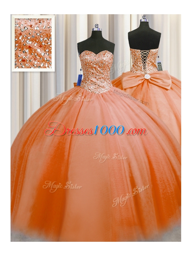 Sexy Puffy Skirt Orange Red Tulle Lace Up Sweetheart Sleeveless Floor Length Quinceanera Gown Beading