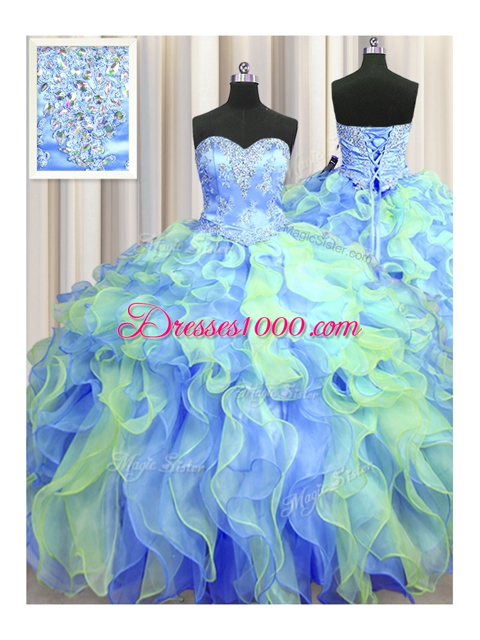 Multi-color Ball Gowns Beading and Appliques and Ruffles Sweet 16 Dress Lace Up Organza Sleeveless Floor Length