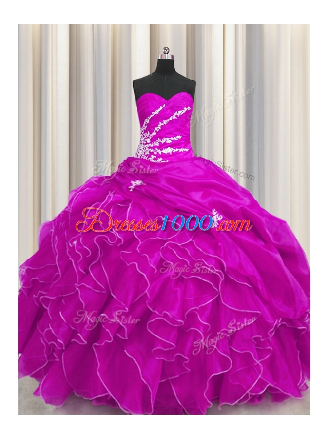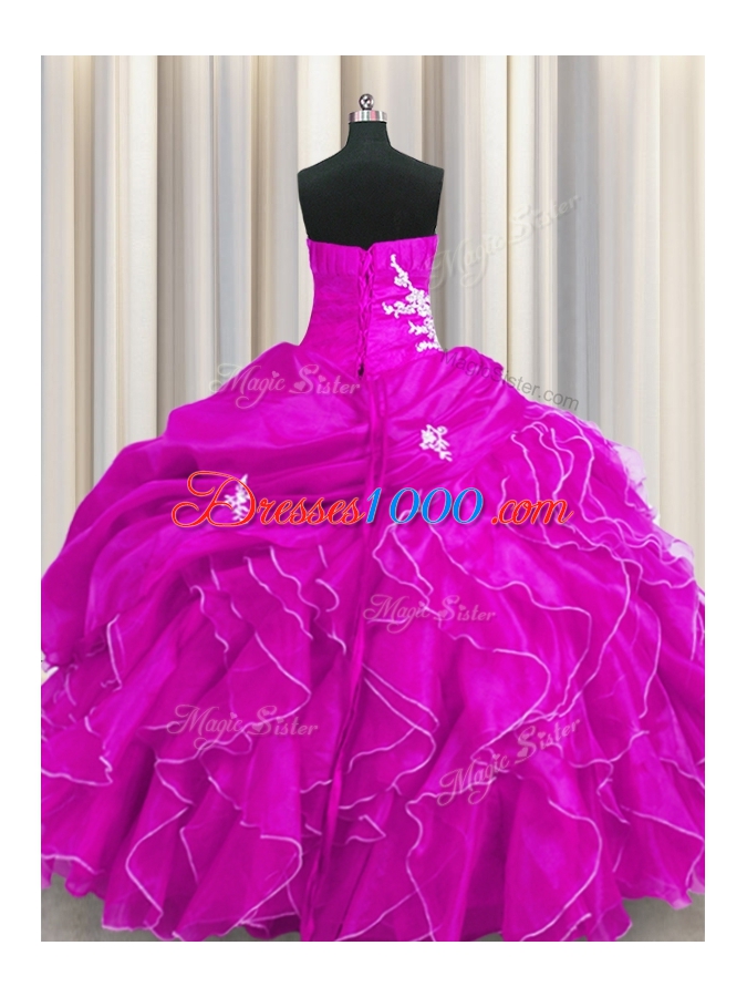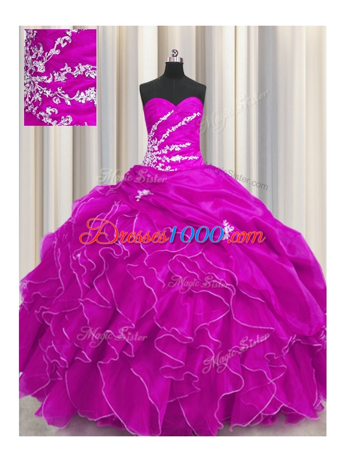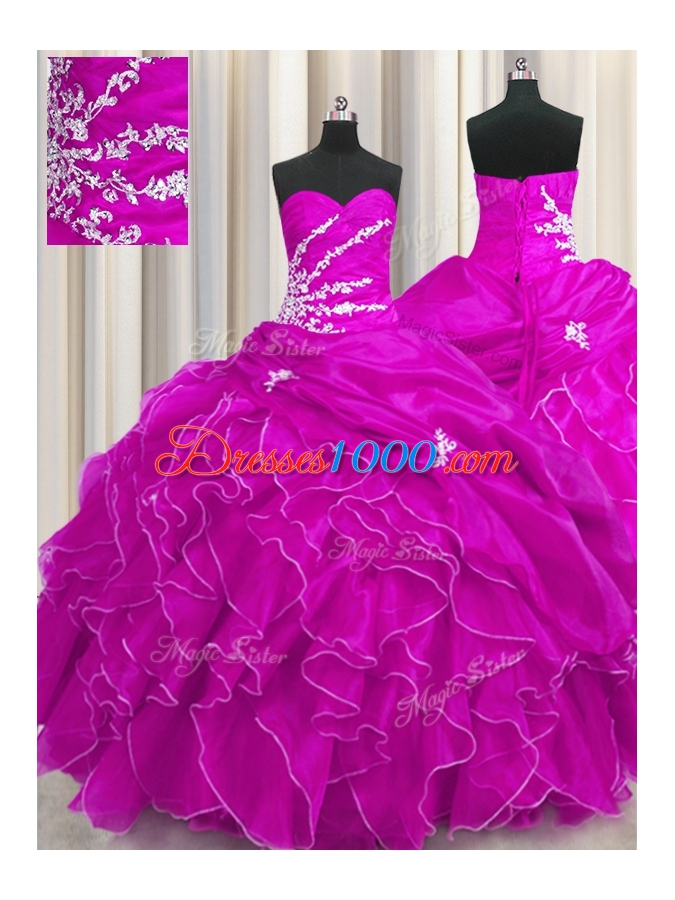 Smart Fuchsia Ball Gowns Sweetheart Sleeveless Organza Floor Length Lace Up Beading and Appliques and Ruffles Ball Gown Prom Dress