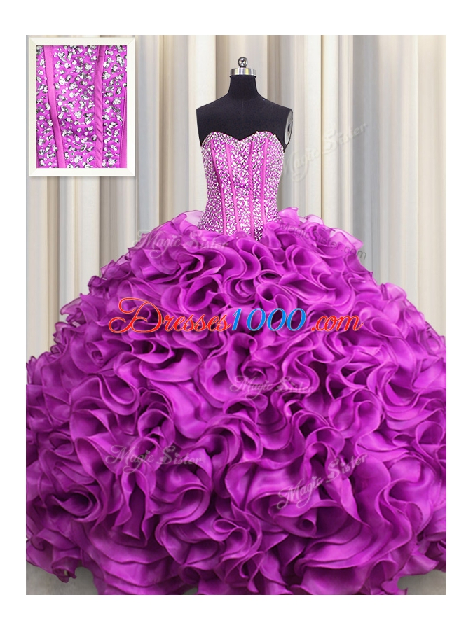 Amazing Visible Boning Floor Length Fuchsia Vestidos de Quinceanera Organza Sleeveless Beading and Ruffles
