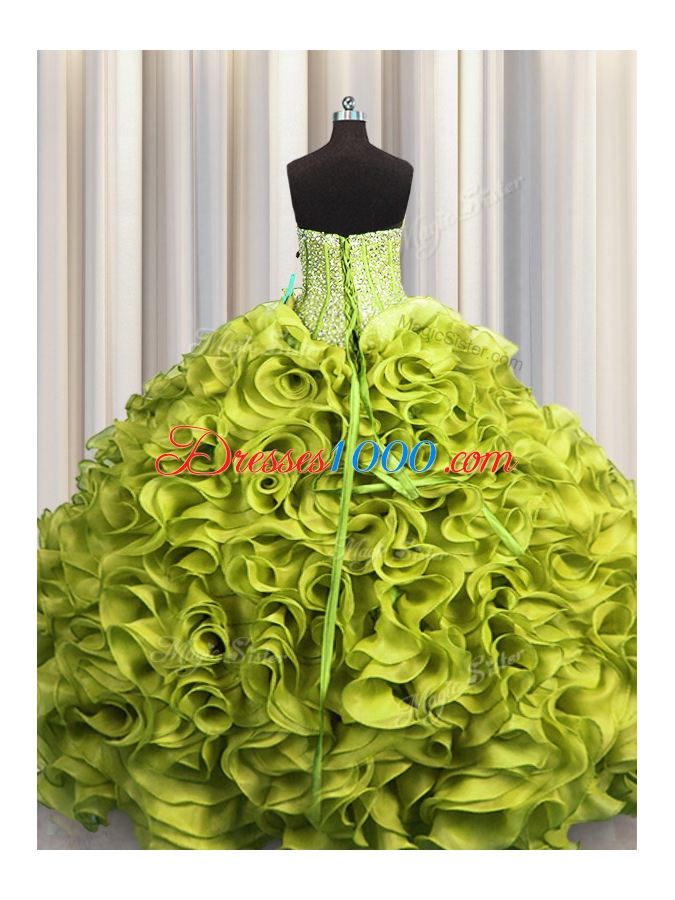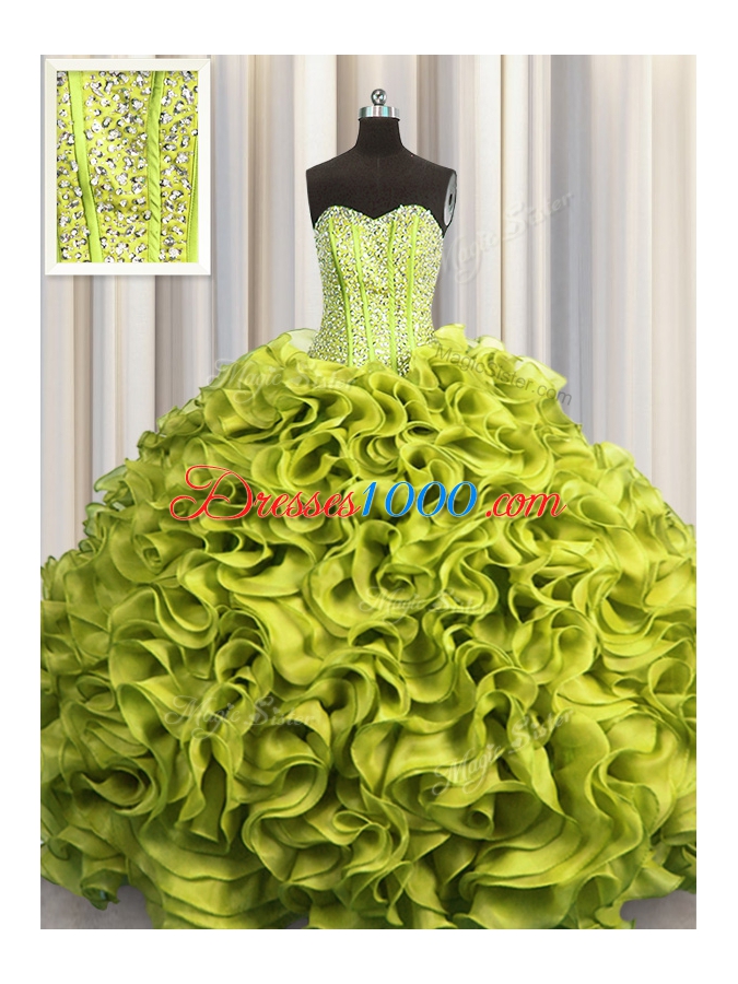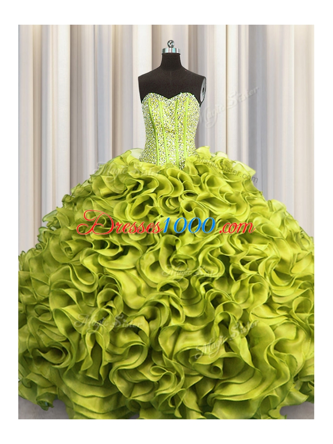 Customized Visible Boning Olive Green Ball Gowns Beading and Ruffles Vestidos de Quinceanera Lace Up Organza Sleeveless Floor Length