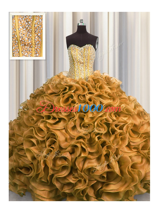 Visible Boning Gold Sleeveless Organza Lace Up Quinceanera Gowns for Military Ball and Sweet 16 and Quinceanera