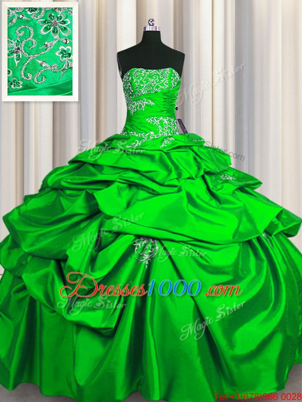 Strapless Sleeveless Sweet 16 Quinceanera Dress Floor Length Appliques and Pick Ups Green Taffeta