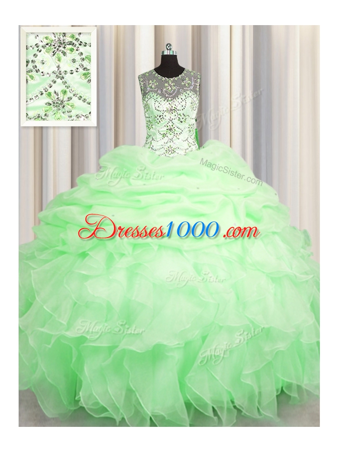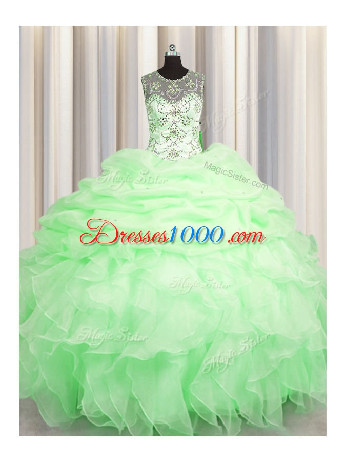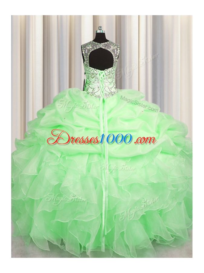 Attractive See Through Organza Lace Up Scoop Sleeveless Floor Length Quinceanera Gowns Beading and Ruffles and Pick Ups