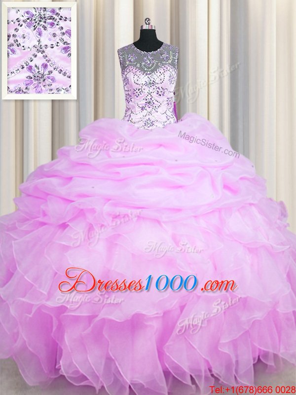 Eye-catching See Through Pick Ups Floor Length Lilac Quinceanera Dresses Scoop Sleeveless Lace Up