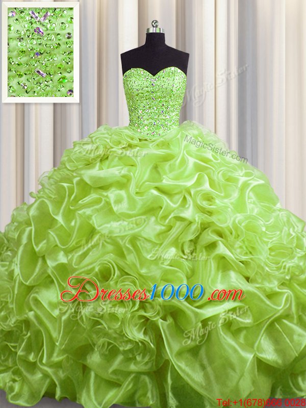 Admirable Yellow Green Quince Ball Gowns Military Ball and Sweet 16 and Quinceanera and For with Beading and Pick Ups Sweetheart Sleeveless Court Train Lace Up