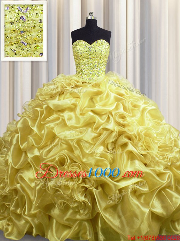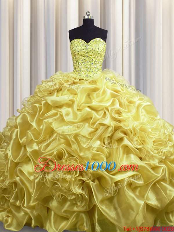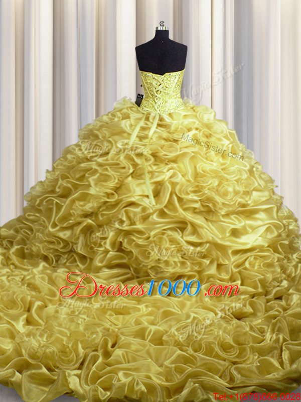 Fabulous Gold Ball Gowns Sweetheart Sleeveless Organza With Train Court Train Lace Up Beading and Pick Ups Sweet 16 Quinceanera Dress