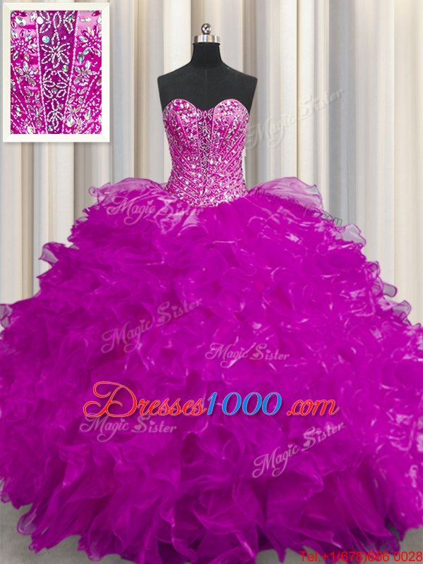 Hot Sale See Through Fuchsia Quinceanera Gowns Military Ball and Sweet 16 and Quinceanera and For with Beading and Ruffles Sweetheart Sleeveless Lace Up