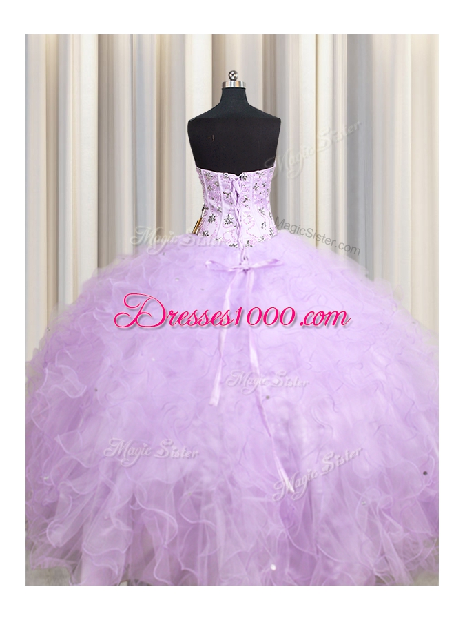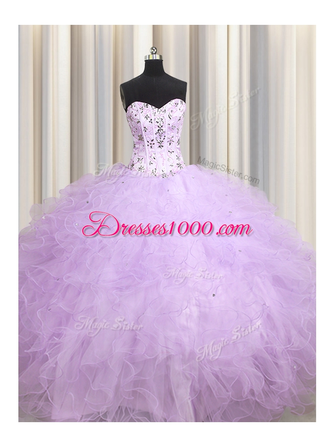 Flare Visible Boning Lavender Sweetheart Lace Up Beading and Appliques and Ruffles Sweet 16 Quinceanera Dress Sleeveless
