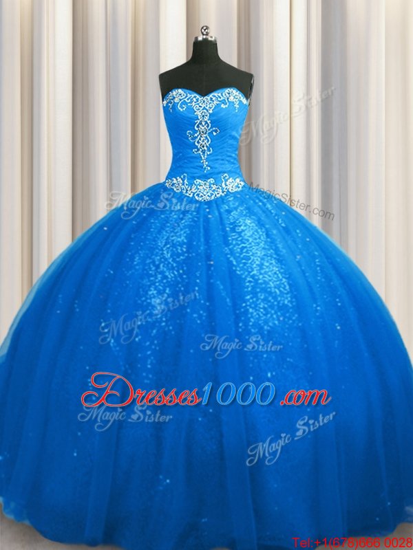 Custom Design Sweetheart Sleeveless Ball Gown Prom Dress With Train Court Train Beading and Appliques Blue Tulle and Sequined