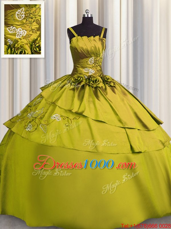 Low Price Embroidery Spaghetti Straps Sleeveless Lace Up Quinceanera Dress Olive Green Satin