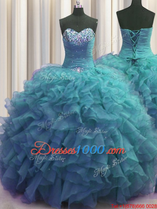 Luxury Beaded Bust Sleeveless Floor Length Beading and Ruffles Lace Up Sweet 16 Dresses with Teal