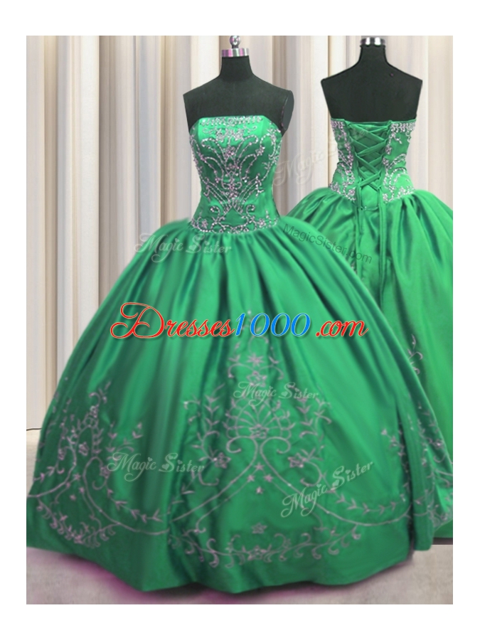 Fashionable Green Ball Gowns Beading and Embroidery 15th Birthday Dress Lace Up Taffeta Sleeveless Floor Length