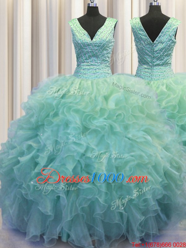 Glittering V Neck Zipper Up Floor Length Zipper Quinceanera Gowns Light Blue and In for Military Ball and Sweet 16 and Quinceanera with Ruffles
