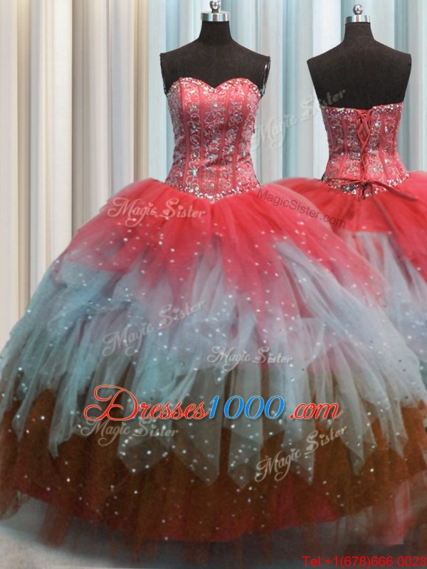 Admirable Visible Boning Multi-color Tulle Lace Up Quinceanera Dresses Sleeveless Floor Length Beading and Ruffles and Sequins