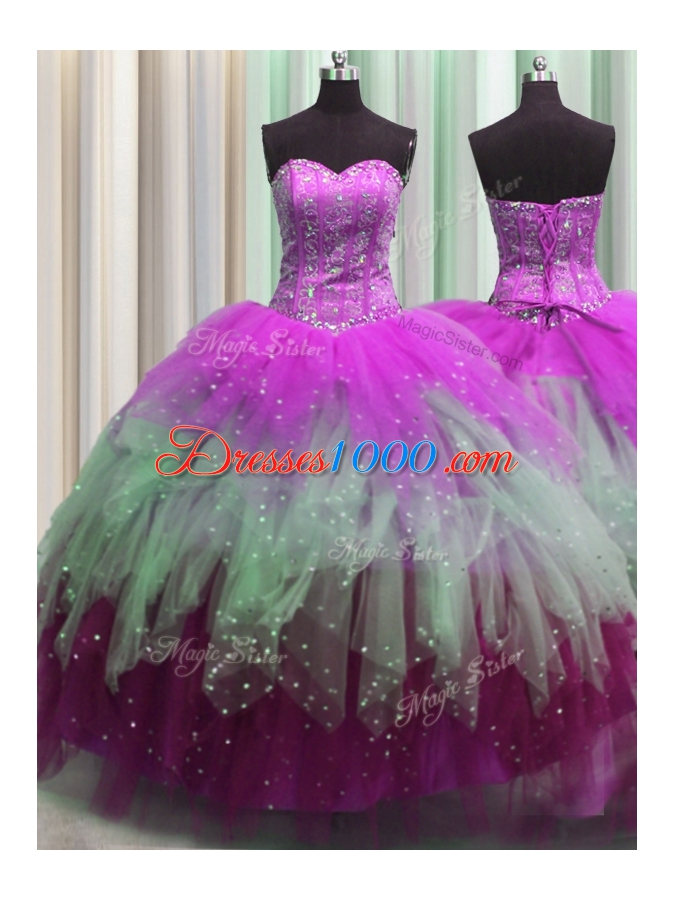 Visible Boning Multi-color Sleeveless Beading and Ruffles and Sequins Floor Length Quinceanera Gown