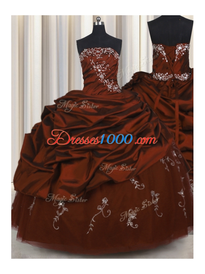 Attractive Embroidery Sleeveless Taffeta Floor Length Lace Up Quinceanera Gowns in Burgundy for with Beading and Appliques and Pick Ups