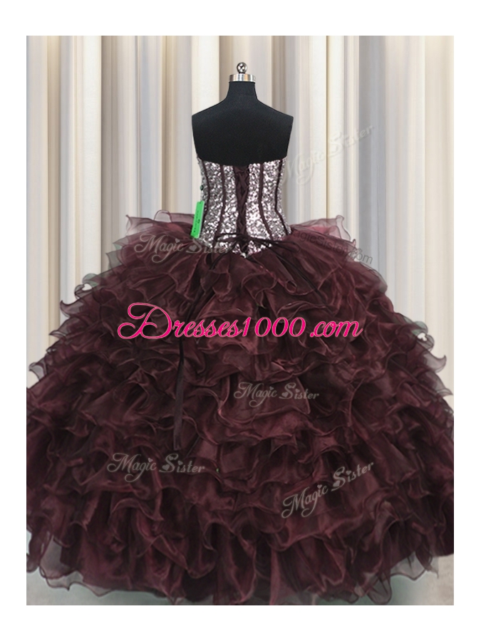 Visible Boning Floor Length Lace Up Quinceanera Dress Brown and In for Military Ball and Sweet 16 and Quinceanera with Ruffles and Sequins