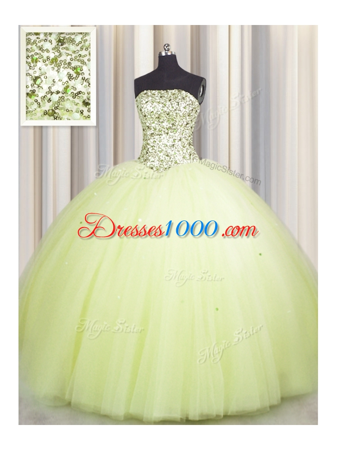 Flare Sequins Big Puffy Floor Length Light Yellow 15th Birthday Dress Strapless Sleeveless Lace Up
