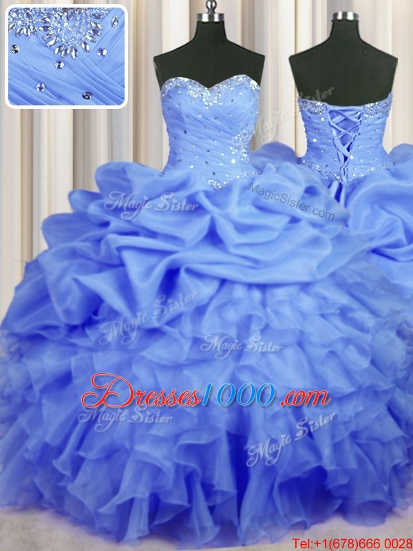Stunning Blue Sleeveless Floor Length Beading and Ruffles and Ruching and Pick Ups Lace Up 15th Birthday Dress